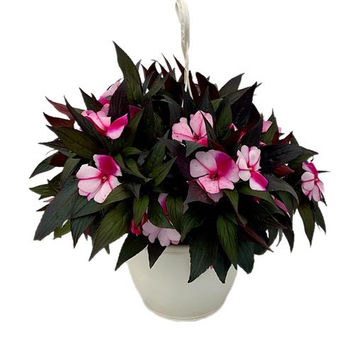 Impatiens New Guinea Rollercoaster Tangy Taffy in a 10-in White Hanging Basket