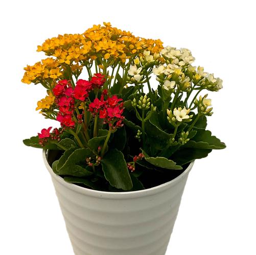 Kalanchoe Trio with Pink, Yellow, and White in an 8-in White Drop-In Vase