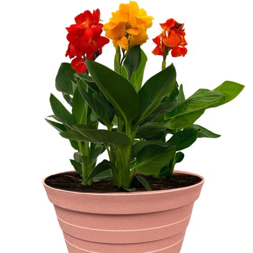 Canna Trio with Green Leaf Orange, Yellow, and Scarlet in a 12-in Tan Pot