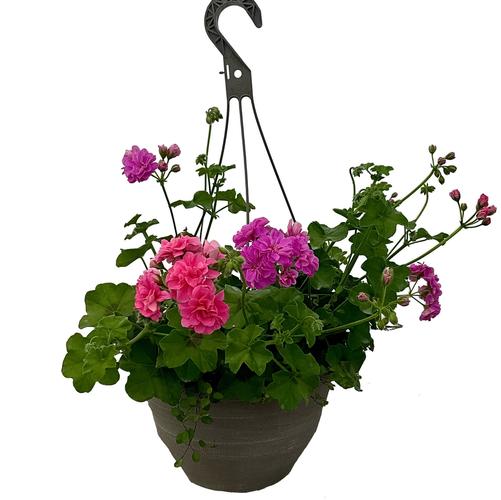 Geranium Ivy Jazz Great Balls of Fire Lilac and Pink with Muehlenbeckia in a 12-in Grey Hanging Basket