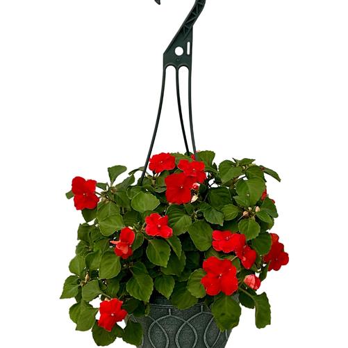 Impatiens Xtreme Red in an 8-in Dark Green Hanging Basket