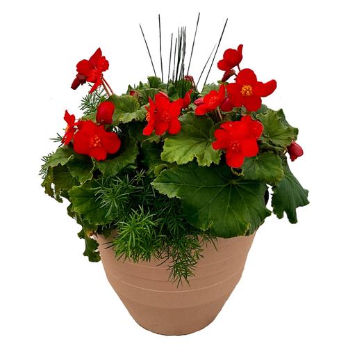 Begonia Rieger Dreamsgarden Macarouge with Asparagus fern and Juncus in a 12-in Tan Pot