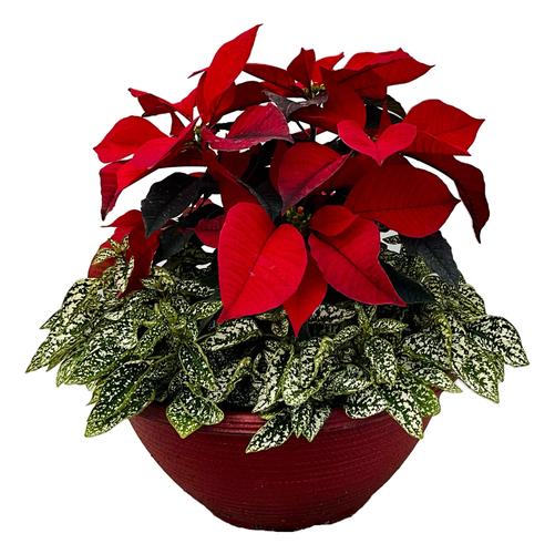 Poinsettia Combo with Red Poinsettia and Hypoestes Splash White in a 12-in Red Bowl